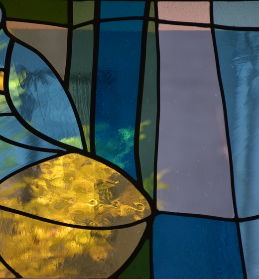 Einige Teile der Bleiverglasung bestehen aus Klarglas, um den Ausblick nach draußen weiterhin zu ermöglichen, und so auch eine Verbindung in die äußere Umgebung aufrecht zu erhalten.